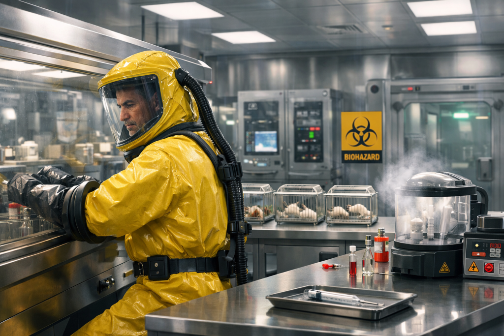 Mostafa eased his legs into the BSL-4 suit, pulled the torso up, rotated the locking ring until it clicked, then slid his arms into the stiff sleeves with their heavy gloves. He lowered the positive-pressure hood over his head and sealed it in place. A moment later the umbilical line snapped to his hip with a hollow clack, feeding him a stream of purified air.