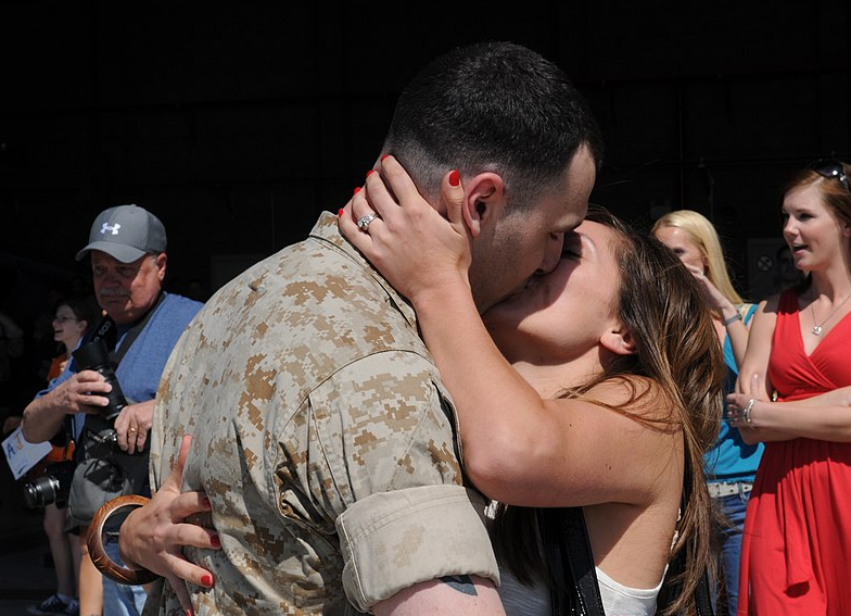 Lance Cpl. David Checrallah hugs and kisses his wife Christina in front of the Marine Attack Squadron 513 hangar at the Marine Corps Air Station in Yuma, Ariz., April 13, 2010. Approximately 100 VMA-513 Marines deployed with the 11th Marine Expeditionary Unit for a seven-month deployment touring the Middle East and Horn of Africa. While on deployment the squadron participated in eight exercises with other nations providing close-air support and escorting helicopters for a majority of the exercises. Source.