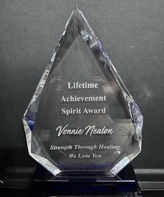 Reaching for a crystal pyramid, her grin is undeniable. “This is my favorite thing in here; it was a gift from the founders of Warriors Heart.” Turning the award around, the inscription is one in simple font with the most profound words: “Spirit Award – Strength through Healing – We Love You.”