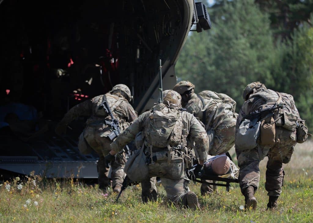 When we finally arrived at the HLZ, I scanned my surroundings to make sure the bird could land there. Once I determined it was clear, I instructed my team to set up a litter next to the truck. With some help, I laid myself onto it. Then it was time to get to work. I directed my team to different items in my aid bag, talked them through starting an IV, assessed and treated a minor flesh wound on my left leg, and instructed them on how to begin a blood transfusion. Once we had done everything we could, the adrenaline wore off, and the pain in my leg became unbearable. The helicopter was about 10 minutes out, so I instructed my team on how to administer ketamine. They performed phenomenally. I coached them through injecting it into my IV, and I got some much-needed relief.