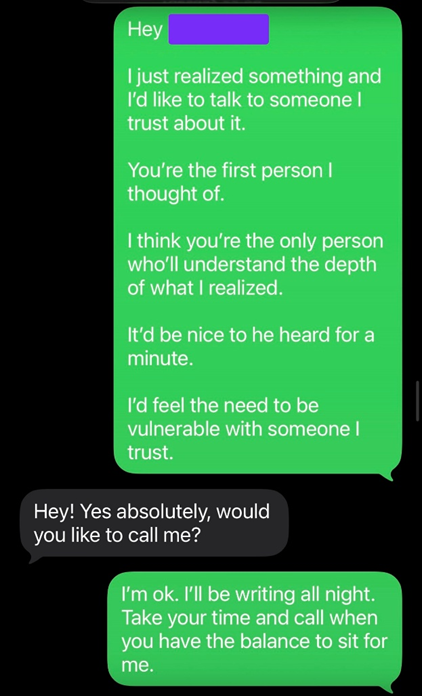 22:58 – A text for help to talk about incoming intense pain of a major realization. Warm reply received.
