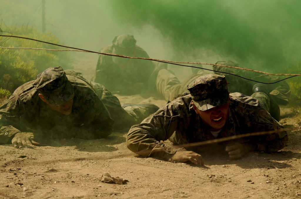 CORONADO, Calif. (June 1, 2020) Special Warfare combatant-craft crewman (SWCC) candidates from Basic Crewman Selection (BCS) Class 111 low-crawl under an obstacle during The Tour at Naval Special Warfare (NSW) Center in Coronado, Calif., June 1, 2020. The Tour is a 72-hour crucible event, which develops intelligent and highly-motivated candidates who will perform as a team under the most demanding conditions. 1 June 2020, (Photo by Petty Officer 1st Class Anthony Walker/U.S. Navy; Public Domain)