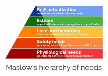 A depiction of Maslow’s hierarchy of needs from the bottom of the hierarchy upward: physiological (food and clothing), safety (job security), love and belonging (friendship), esteem, and self-actualization. https://www.simplypsychology.org/maslow.html