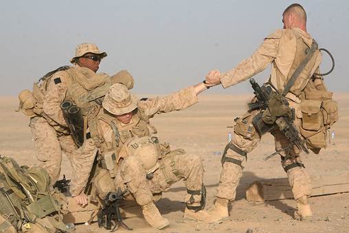 U.S. Marines helping one another stand up after being weighed down with military gear.https://www.battlebuddiessupport.com/the-road-to-recovery/