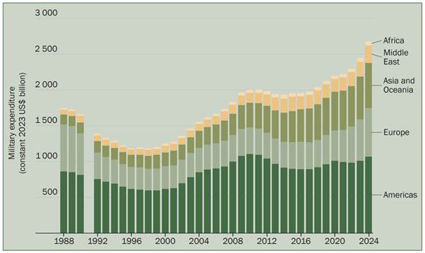 The strategic bet on electronics-heavy modernization is happening alongside a clear rise in global defense spending. SIPRI reports that world military expenditure rose 9.4% in real terms to $2,718 billion in 2024, and that total spending equaled 2.5% of global GDP.