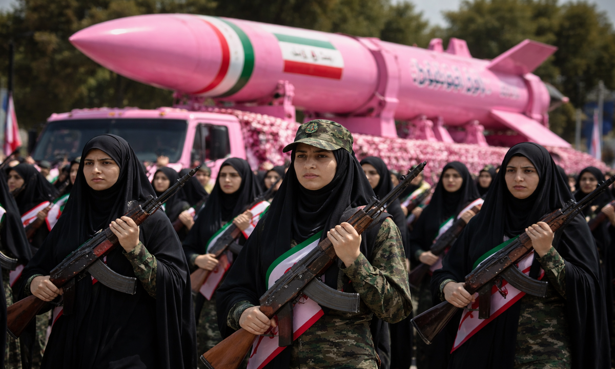 At the same time, Tehran staged highly visible parades featuring women and girls in military-style formations—some riding in pink vehicles mounted with weapons.