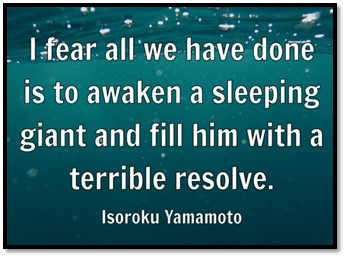 [Editor’s Note: The above is a film quote by Japanese Admiral Isoroku Yamamoto regarding the 1941 attack on Pearl Harbor by forces of Imperial Japan. The quotation is portrayed at the very end of the 1970 film Tora! Tora! Tora!]