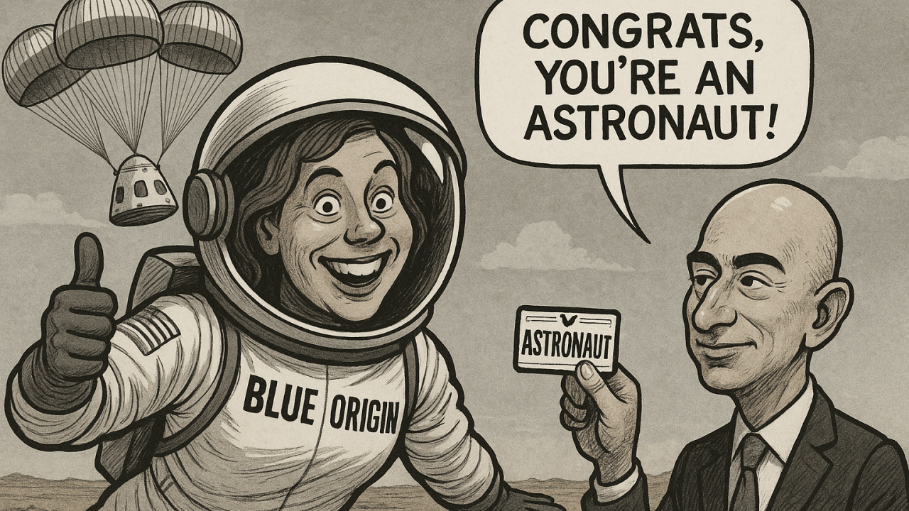 Thanks to Jeff Bezos’ latest PR masterstroke, a handful of women now join the hallowed ranks of space explorers after a journey barely longer than a bathroom break. No grueling training, no orbits, no actual risk — just a quick pop above the Kármán Line and a soft plop back into the desert… plus a shiny “astronaut” badge for their troubles.