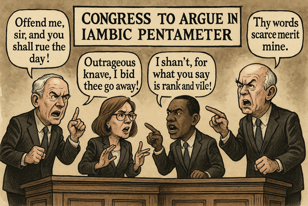 In an historic bid to modernize dysfunction, the United States Congress announced Monday that all future debates will be conducted exclusively in iambic pentameter—a 16th-century poetic meter once used by Shakespeare, now apparently seen as a time-saving device in American governance.