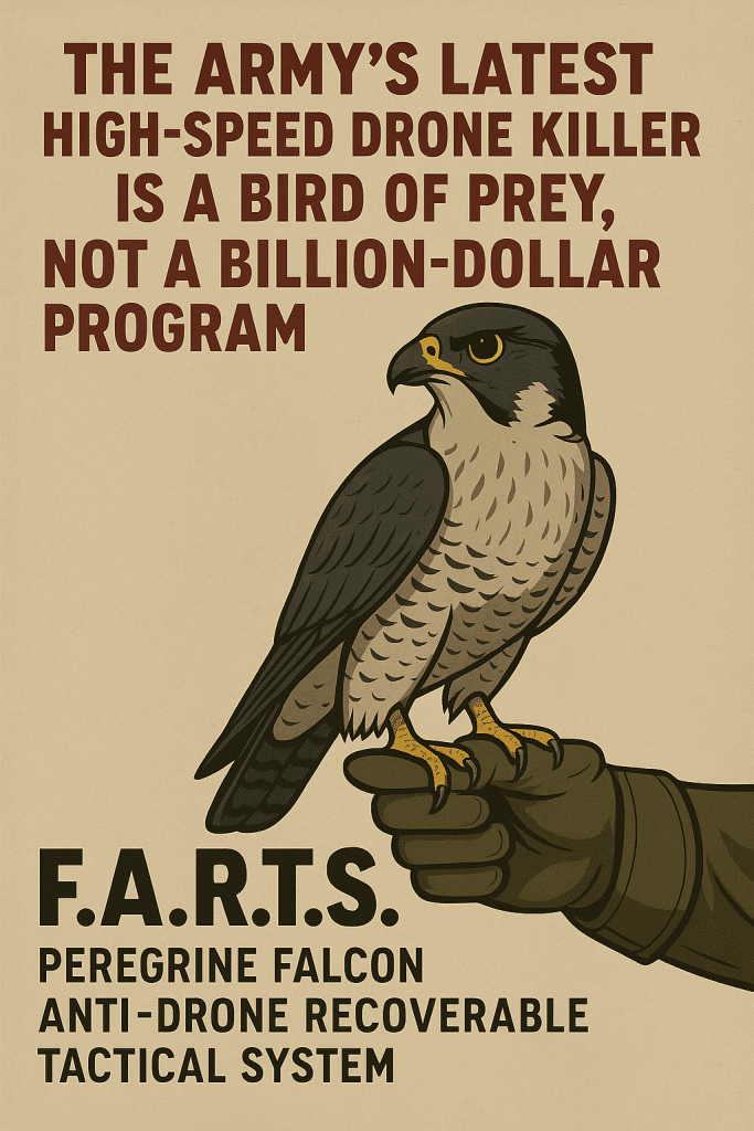 So, after burning through untold millions on hardware that can’t seem to outsmart a remote-controlled quadcopter, the Army is turning to something older, faster, and far more efficient: birds of prey. Enter the Peregrine Falcon Anti-Drone Recoverable Tactical System, or, as Army planners insist on calling it, F.A.R.T.S.