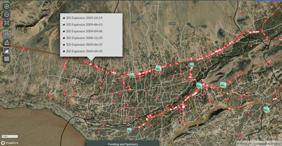 Deep mapping lends itself well to the complex conflict in Afghanistan by allowing for multiple data layers. Project Athena began with data on Improvised Explosive Devices (IED), a frighteningly routine part of life in a post-9/11 battlespace. In the Project Athena site, you can view every IED strike in the area and then look more closely by clicking on the data point. This is where the project goes beyond a standard 2D map. Every IED location is tagged with metadata such as the date, the number of people killed in action (including allies, enemies, and civilians), and a summary of the event.
